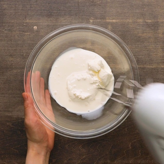 4.ミキサーに(3)、クリームチーズ、ヨーグルト、砂糖を入れ、なめらかになるまで混ぜる。