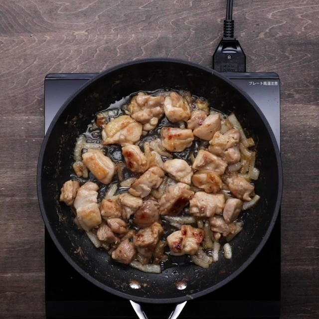 2.フライパンを熱してごま油をひき、鶏肉を皮を下にして並べて強火で2分焼く。焼き目が付いたら返し、玉ねぎを加えて中火で5分炒める。しんなりしたらAを加えて炒め煮する。