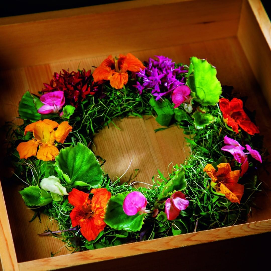 桐箱をキャンバスに見立て、絵画のように美しく盛りつけたサラダ。