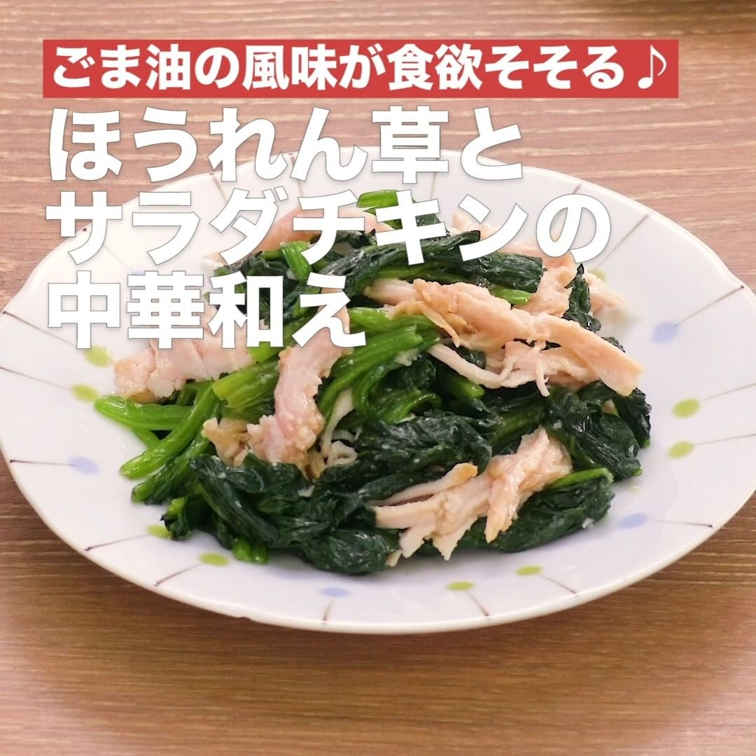 ⑦<ごま油の風味が食欲そそる♪ほうれん草とサラダチキンの中華和え>