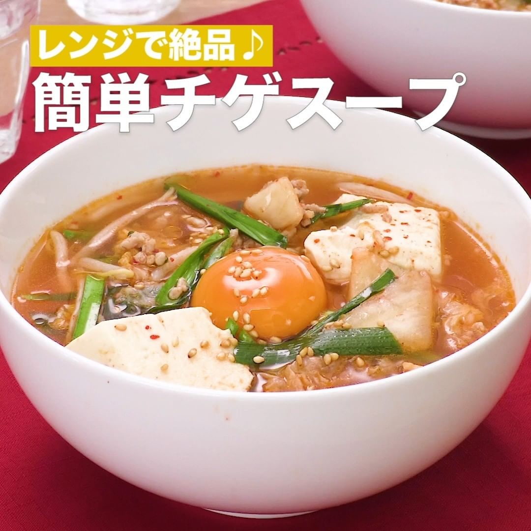 お野菜たっぷり♪一品でも大満足の具沢山スープのご紹介です!キムチをたっぷり入れてピリッとした辛さが食欲を刺激します!コンロと包丁は使わず、サクッと仕上がるボリューム満点なおかずスープです♪