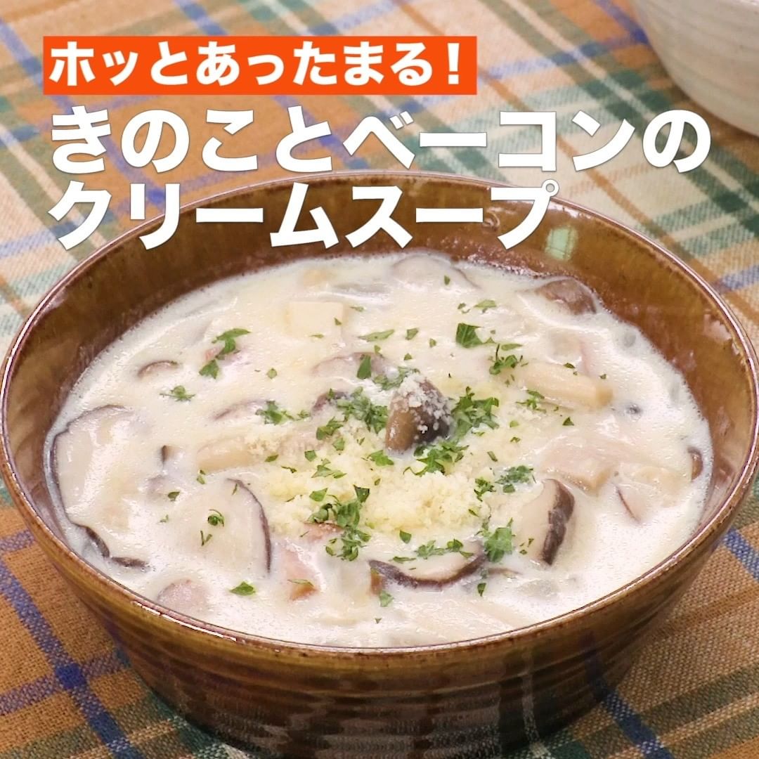 ①<ホッとあったまる!きのことベーコンのクリームスープ>