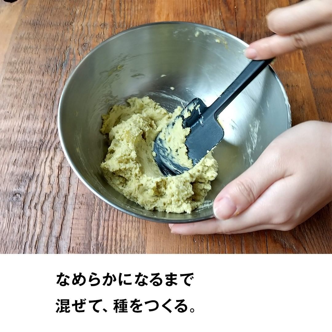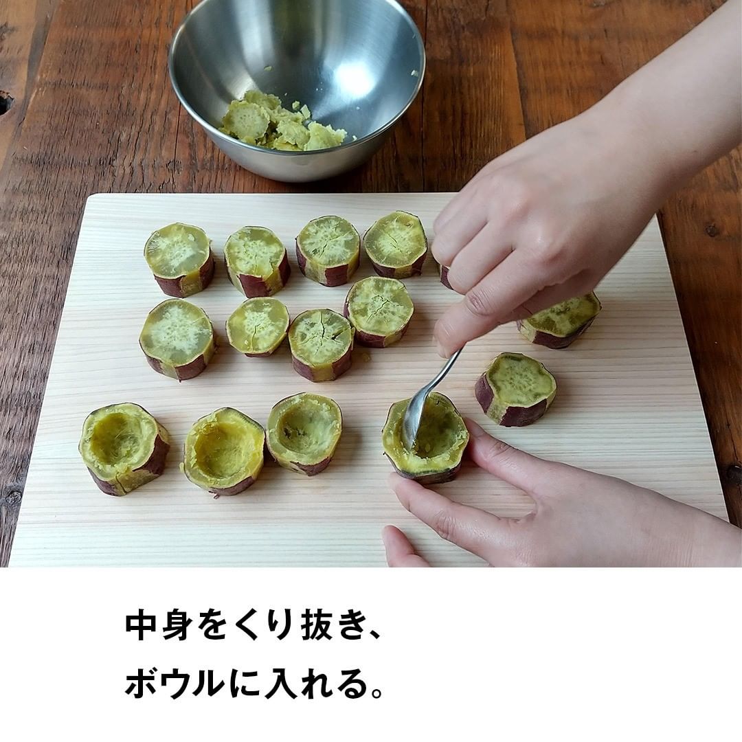 3. 2cmの輪切りにし、小スプーンで中身をくり抜きボウルに入れる(端の細い部分は皮をむいて一緒に使う)。フォークを使って細かくつぶし、砂糖、有塩バター、牛乳を加えてなめらかになるまでゴムベラで混ぜ合わせスイートポテト種をつくる。