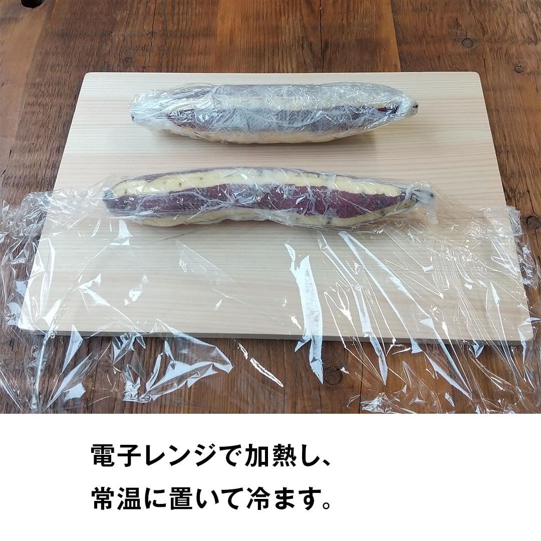 2. キッチンペーパーで1.を包み、水で濡らしてからラップで包んで600Wの電子レンジで5分、さつまいもがやわらかくなるまで加熱し、5分常温に置いて冷ます。