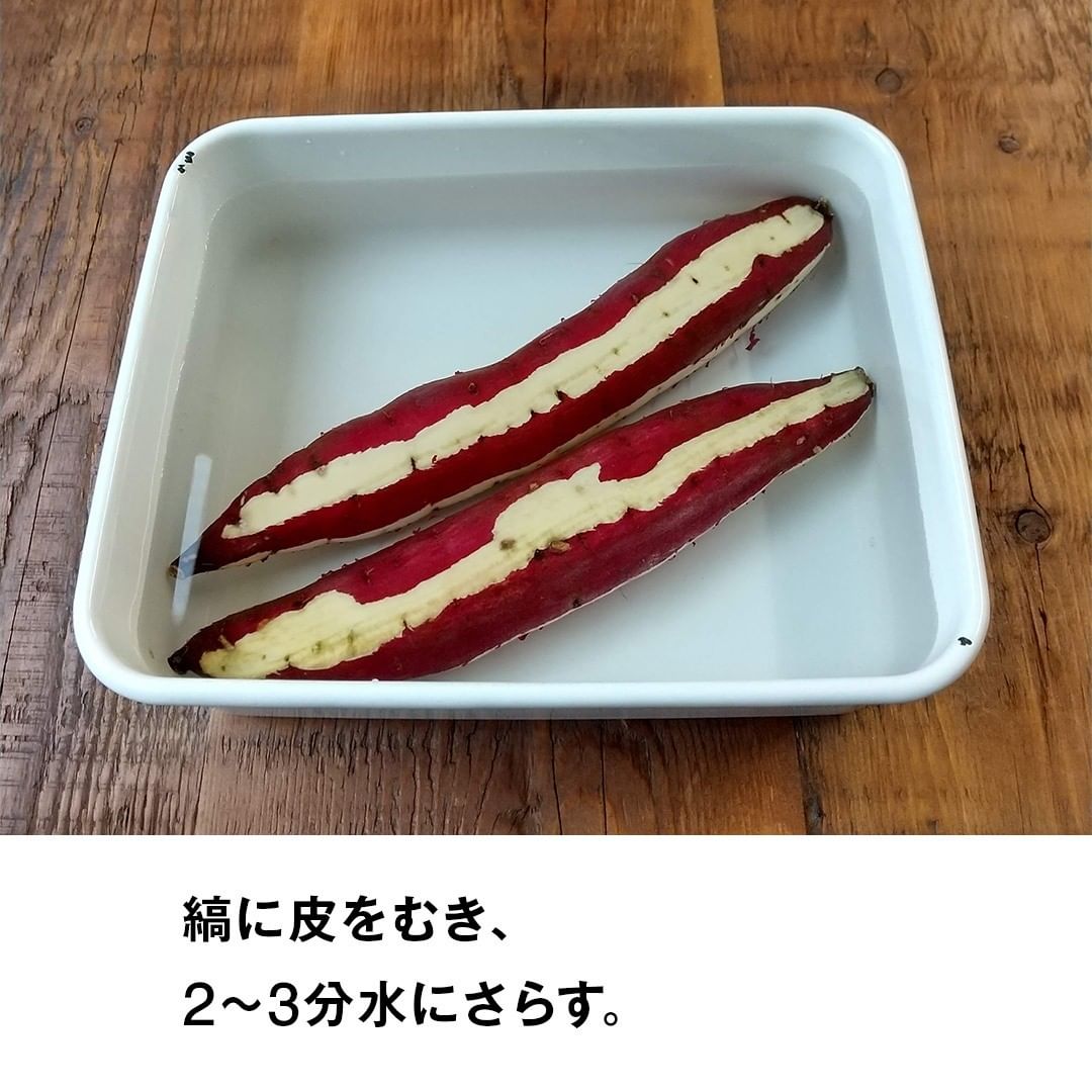 1. さつまいもは皮付きのままよく洗い、ピーラーで縞に皮をむき、2~3分水にさらす。