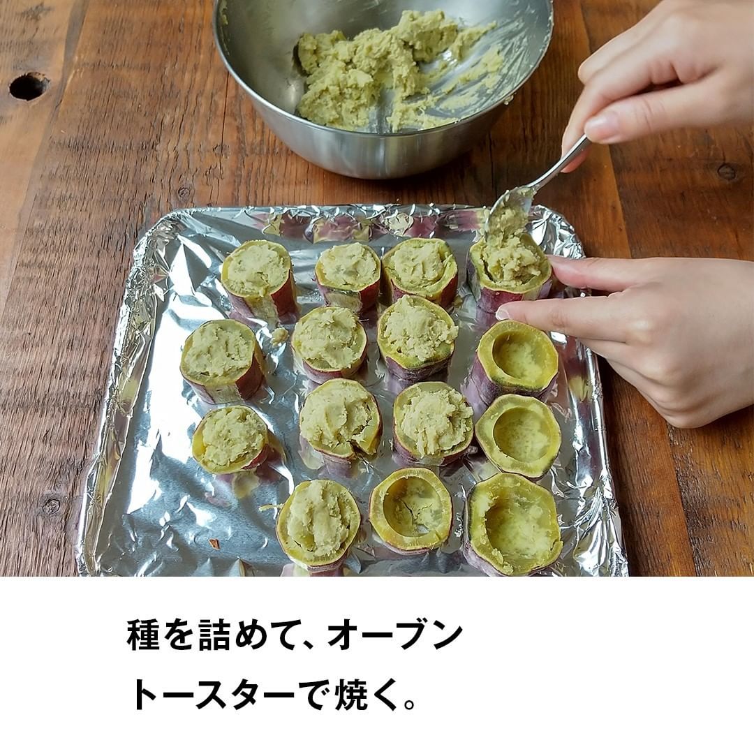 4. 3.の中身をくり抜いたさつまいもにスイートポテト種を詰め、ツヤだし用卵黄をスプーンで塗り、好みで黒ごまをかけ、750Wのオーブントースターで5分(焼き色がつくまで)焼く。