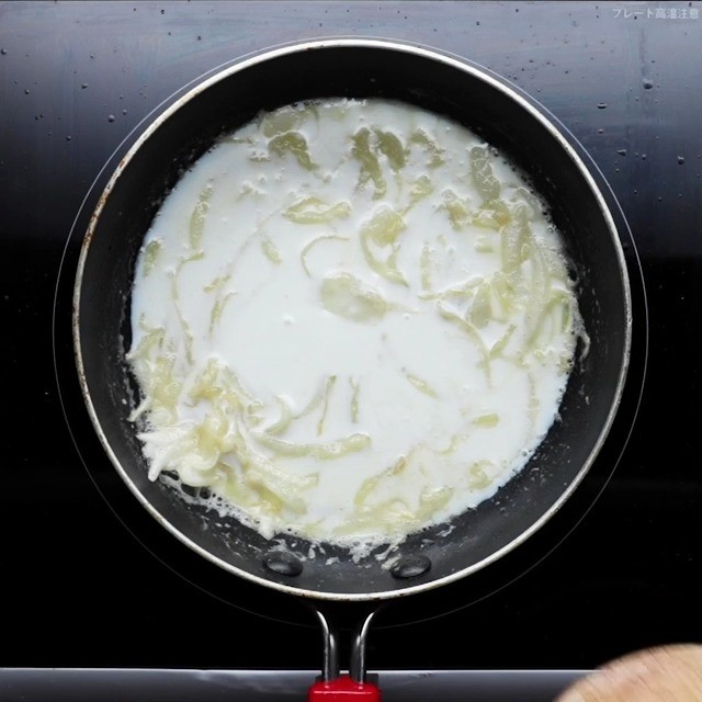 4.薄力粉を加えてダマが無くなるまで炒める。牛乳を2回に分けて加え、その都度混ぜる。とろみが付いたら塩、コショウで味を整えて火から下ろす。