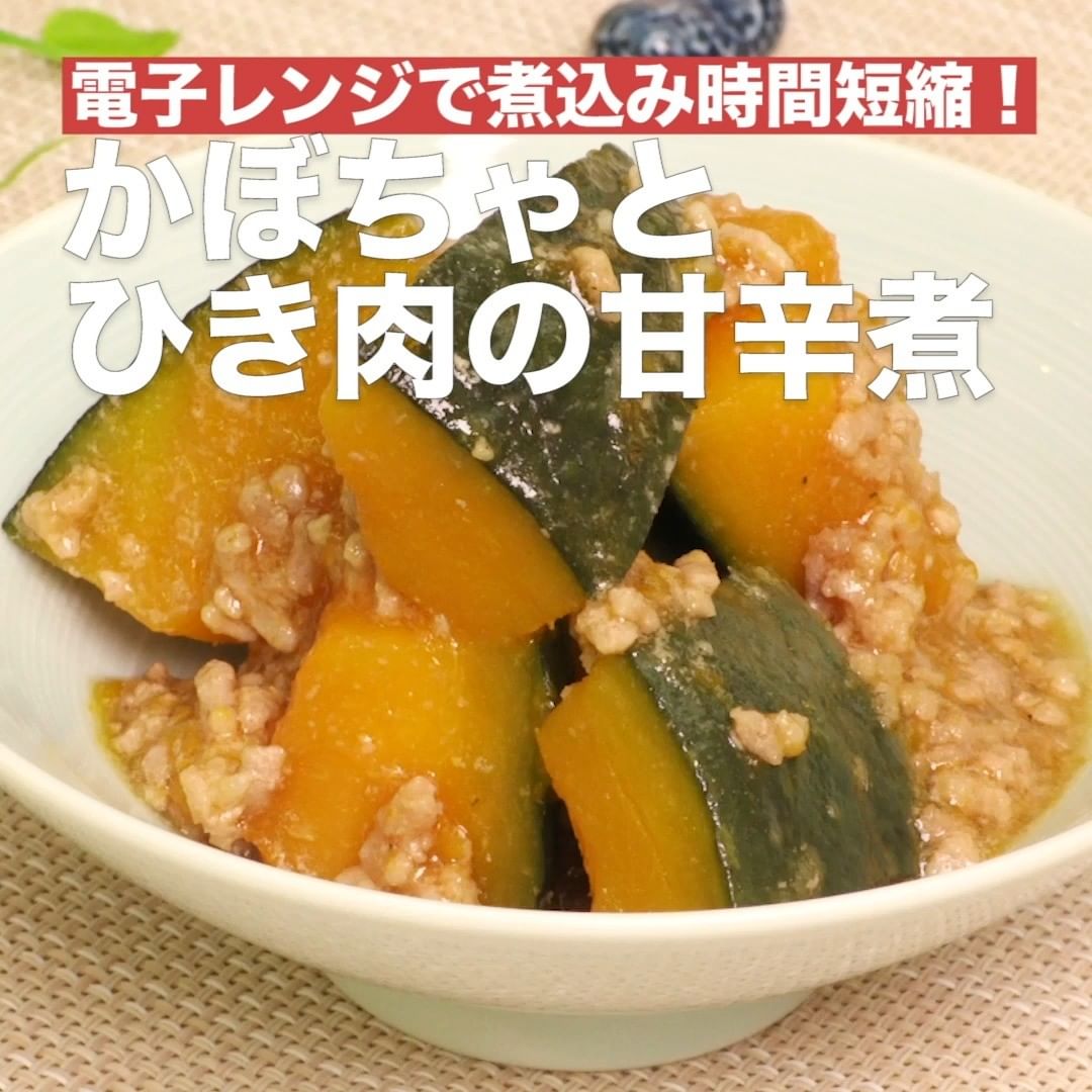 ⑥<電子レンジで煮込み時間短縮!かぼちゃとひき肉の甘辛煮>