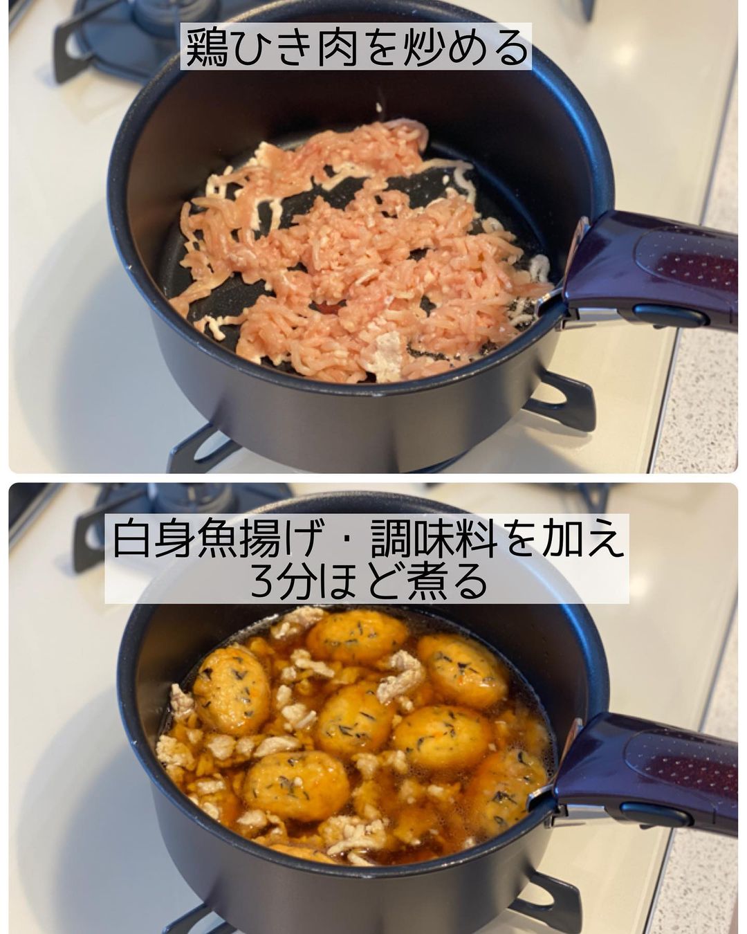 ➊鍋にサラダ油を中火で熱し、鶏ひき肉を炒める。鶏ひき肉の色が変わったら、白身魚揚げ・〔𝙰〕を加え、𝟹分ほど煮る。