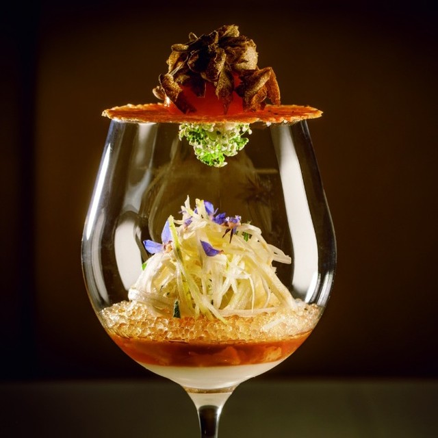 写真▷蓋をするのは玉ねぎのチュイルで上には卵黄のコンフィとトリュフ。これをスプーンで壊して中に落とし、魚介のタルタルやカリフラワーのムース、トマトコンソメのキャビア仕立てと混ぜていただく。
