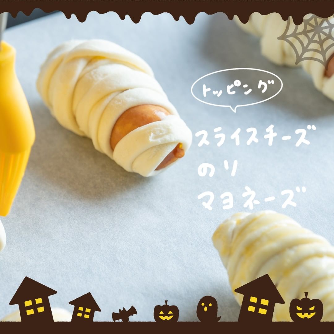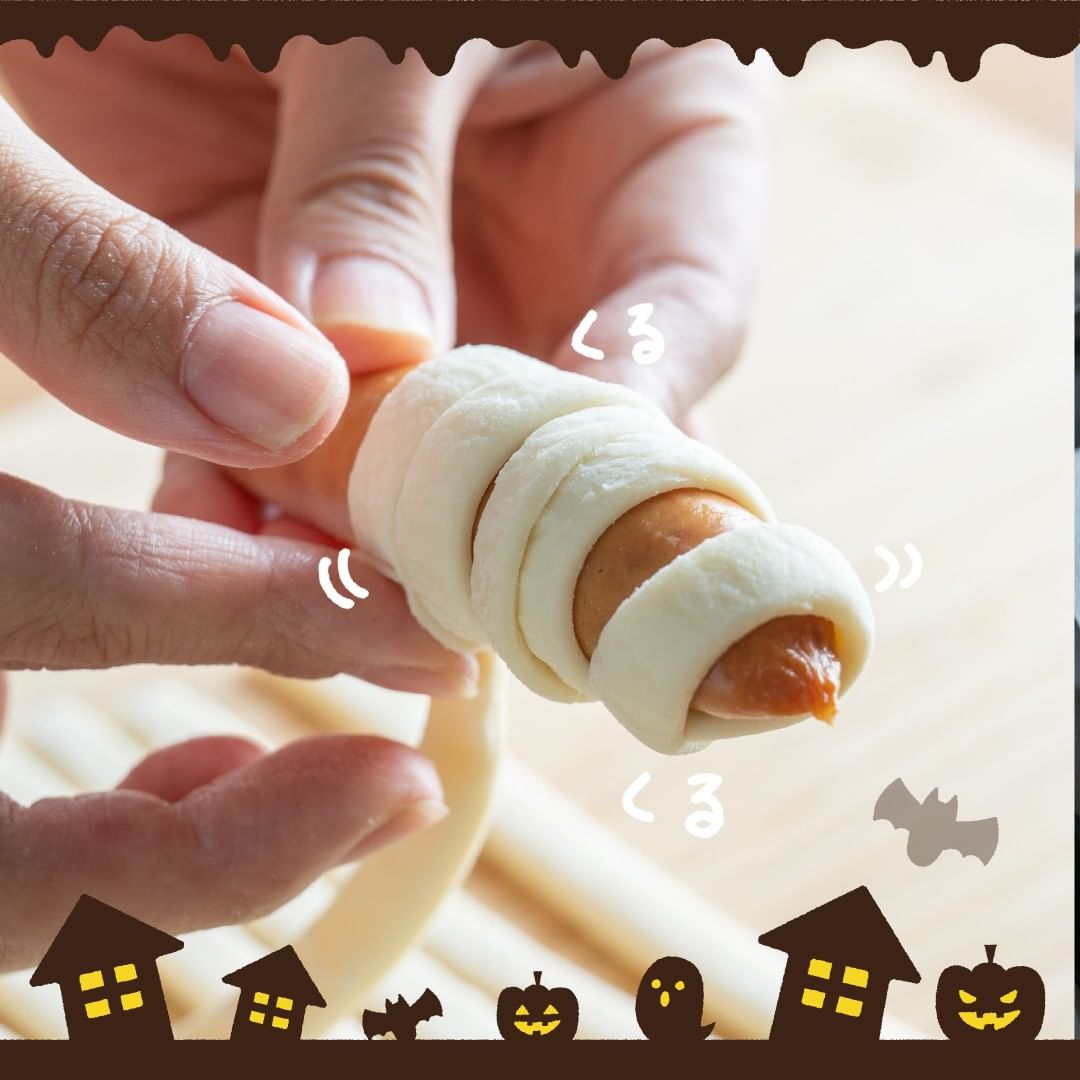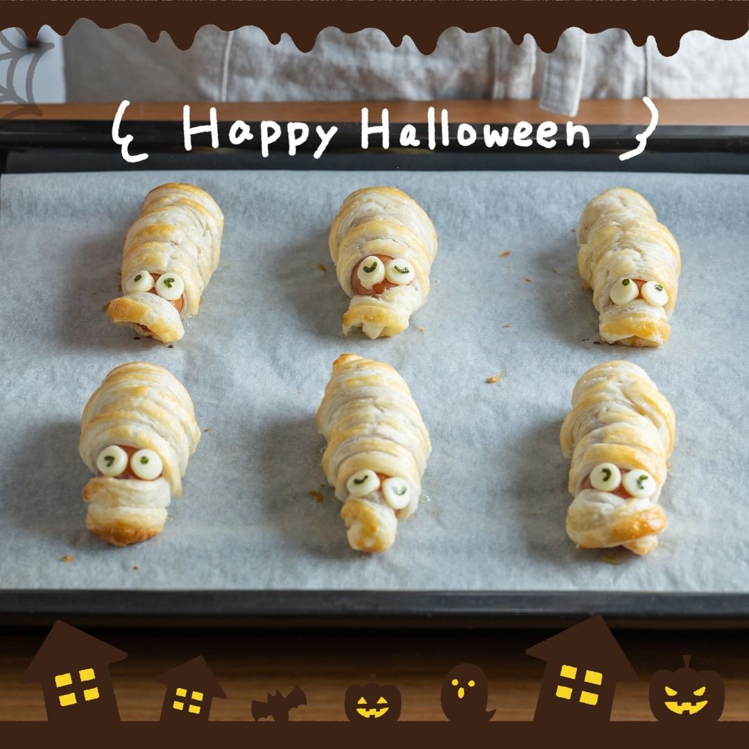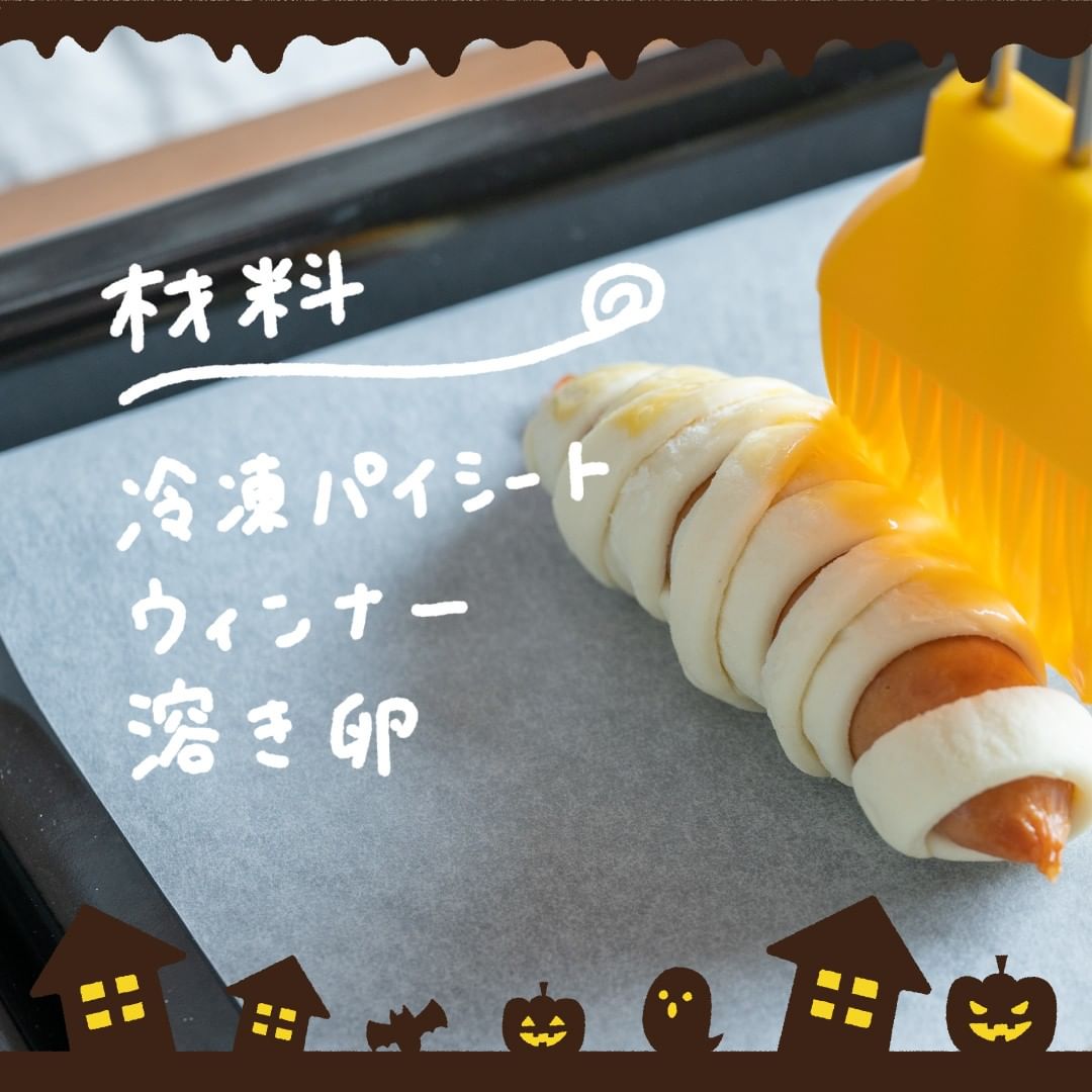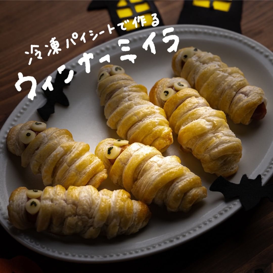 ウインナーに冷凍パイシートを巻き付けてミイラのように仕上げました!