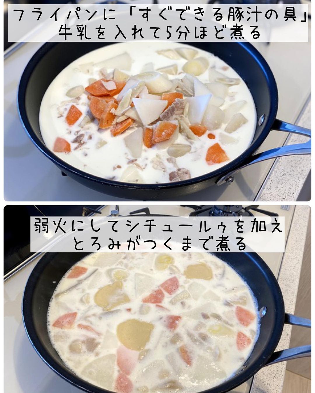 ➊フライパンに凍ったままの「すぐできる豚汁の具」・牛乳を入れて中火にかけ、5分ほど煮る。