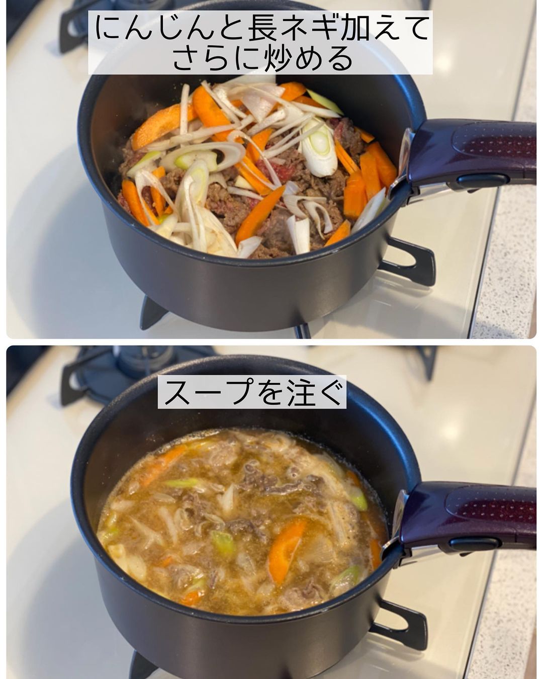 ➋鍋を中火で熱し、牛肉を炒める。牛肉の色が変わったら、にんじん・長ネギを加えてさらに炒める。