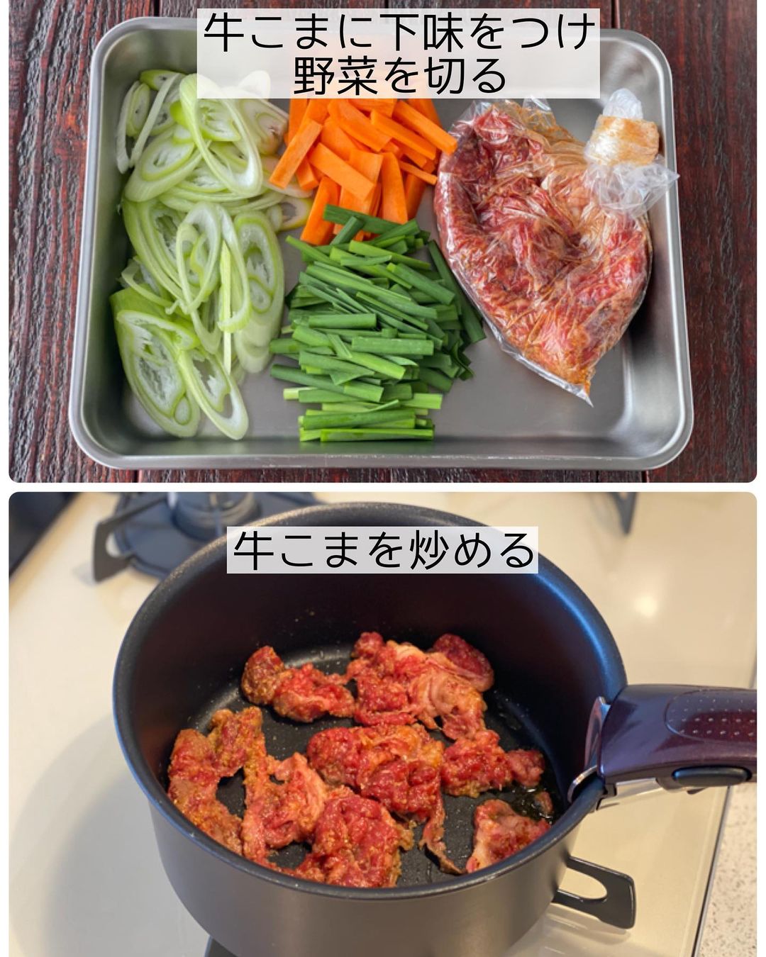➊牛肉は〔𝙰〕を揉み込む。にんじんは短冊切りに(薄めだと◎)、長ネギは斜め薄切りにする。にらは𝟹〜𝟺𝚌𝚖長さに切る。