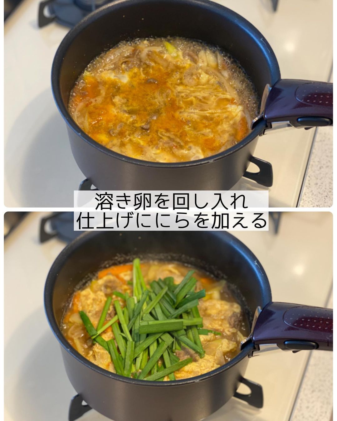 ➌長ネギがしんなりしたら【𝙱】を加えて煮る。にんじんが柔らかくなったら、溶いた卵を回し入れる。好みの固さになったらにらを加えてサッと煮る。