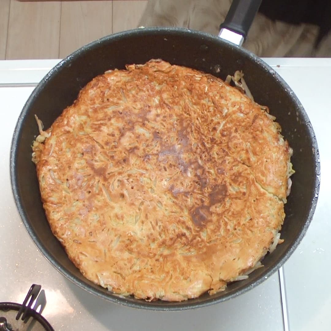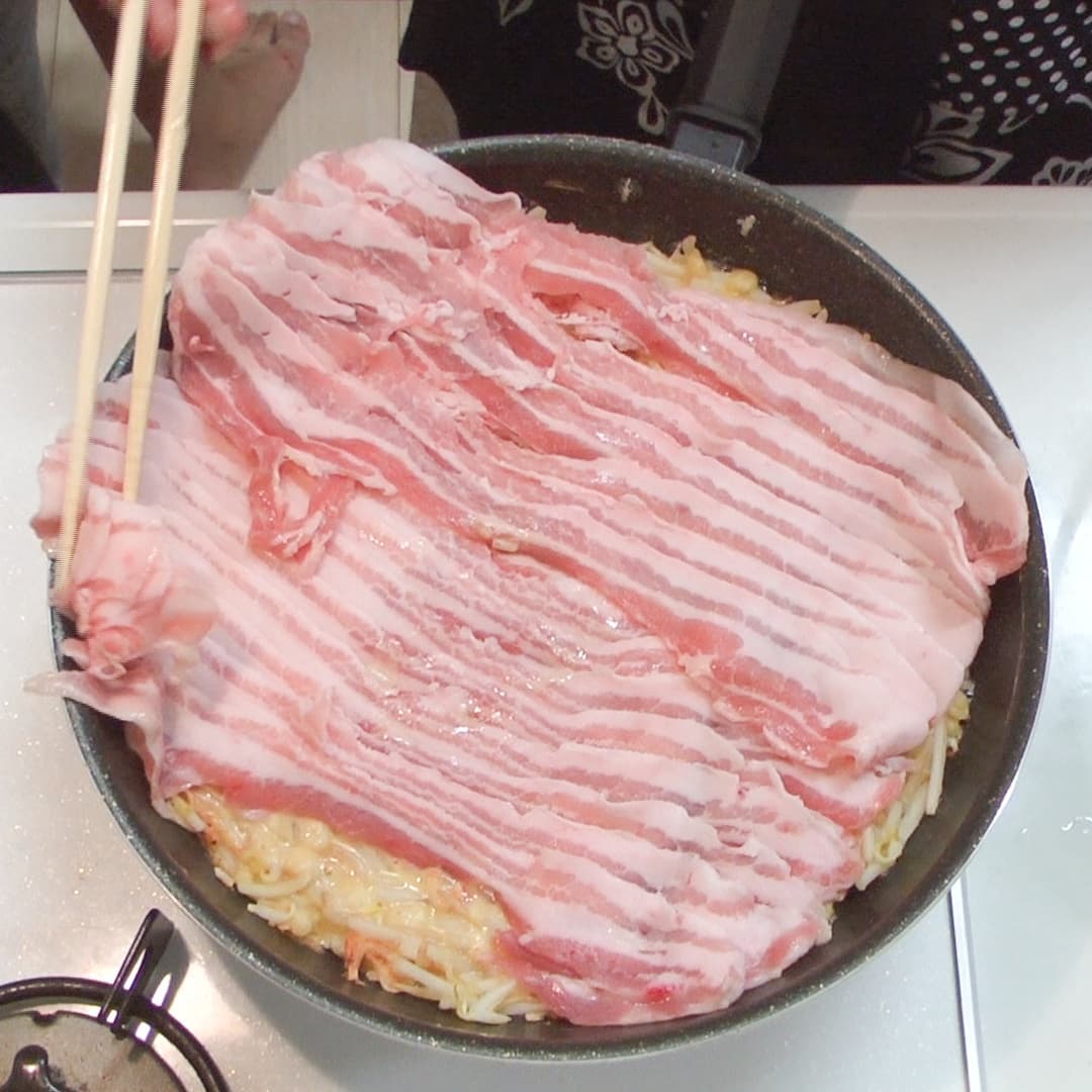④豚バラ(400g)をパックからそのままひっくり返して蓋をして、豚バラと生地に火が通るまで約8分焼く