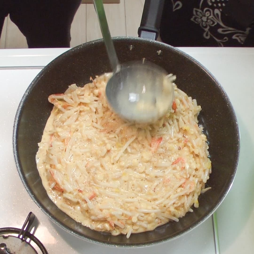 ②ボウルにもやし、薄力粉(300g)、卵(6個)、水(300cc)、だしの素(6袋)を入れて混ぜる