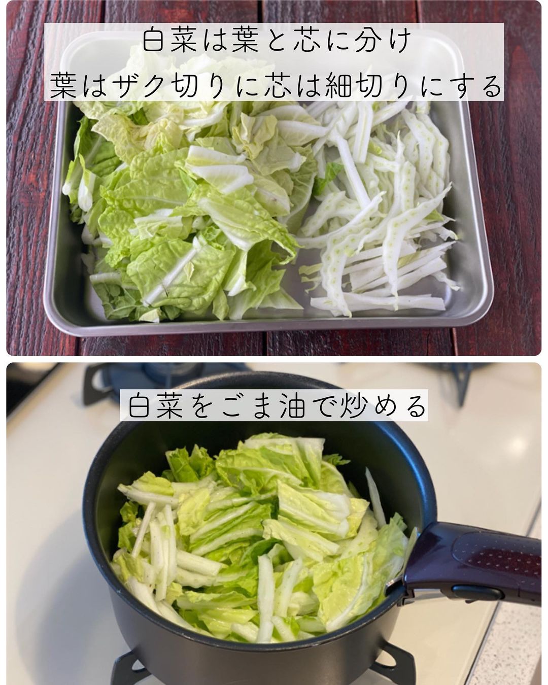 ➊白菜は葉と芯に分け、葉はザク切りに芯は細切りにする。