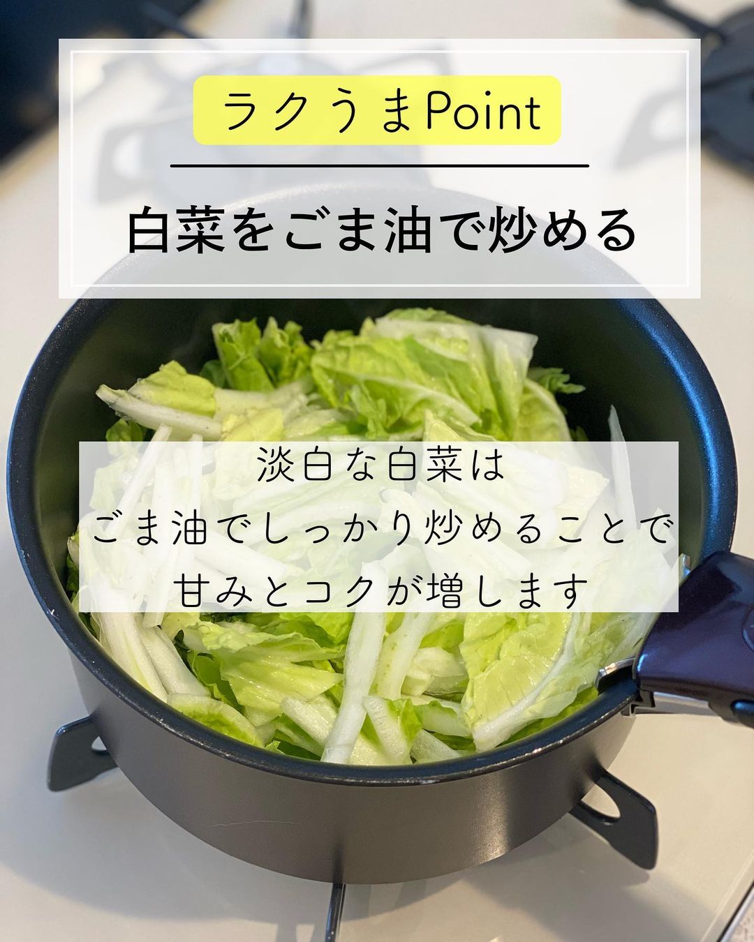 ➋鍋にごま油を中火で熱し、1を炒める。しんなりしたら豚肉を加え、さらに炒める。豚肉の色が変わったら〔𝙰〕を加え𝟹分ほど煮る(中火のままで𝙾𝙺)。お好みで白ごまをふる。