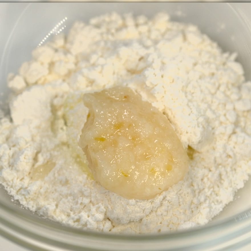 ②グラニュー糖10g、薄力粉大さじ1・1/2を加える
