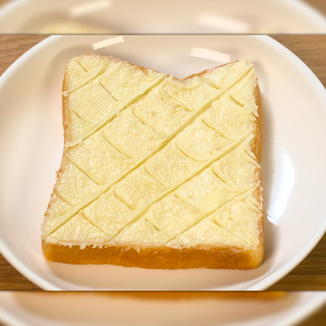 ④混ぜた生地を食パンに塗り、ナイフで格子状に線を入れる