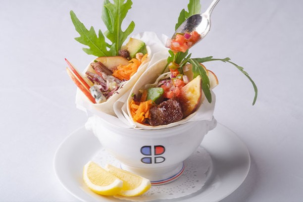 野 菜やフルーツと一緒にトルティーヤで包んだ、タコススタイルの一品。