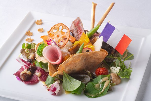 金沢で採れた野菜や黒イチジク、旬のキノコを使って彩り豊かに仕上げられている。