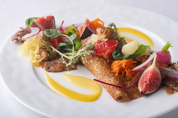 ガレット生地で器を作り盛り付けたお料理は、まるでパフェのようで思わず楽しい気分になれる一皿。