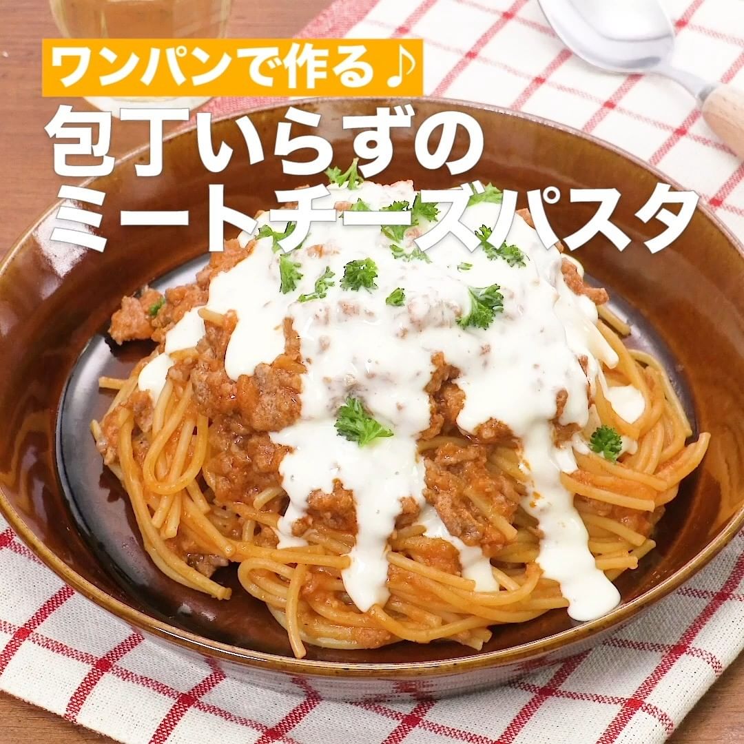 ①<ワンパンで作る♪包丁いらずのミートチーズパスタ>