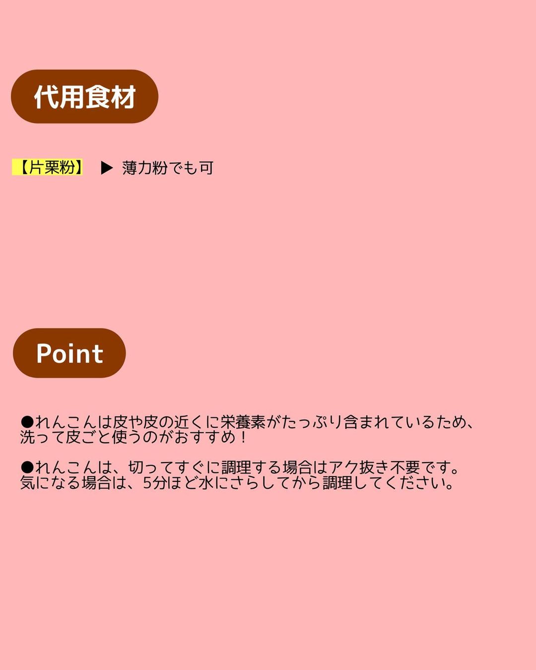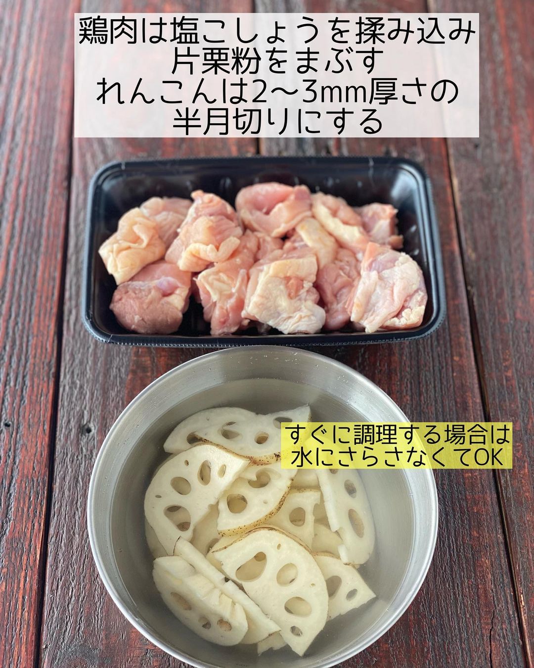 ➊鶏肉はひと口サイズに切り、ポリ袋に入れて塩・こしょうを揉み込む。片栗粉を加えて上下にふり、全体にまんべんなくまぶす。れんこんはよく洗い、皮ごと𝟸〜𝟹𝚖𝚖幅の半月切りする。(すぐに調理する場合は、水にさらさなくて𝙾𝙺!)