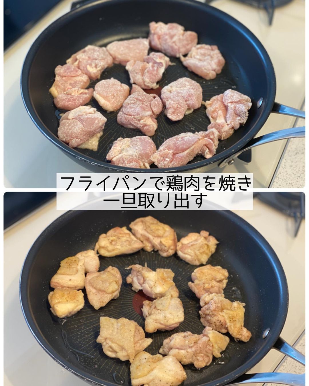 ➋フライパンにサラダ油を中火で熱し、鶏肉の皮目を下にして並べる。途中上下を返し、全体に火が通るまで𝟻分ほど焼いて一旦取り出す。