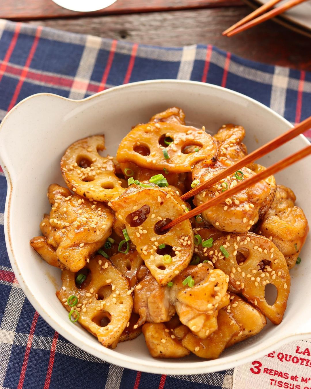 ➍れんこんに火が通ったら2の鶏肉を戻し入れ、ペーパータオルで余分な油を拭き取る。合わせた〔𝙰〕を回し入れ、照りがでるまで炒め煮する。お好みで白いりごま・刻みねぎをトッピングする。