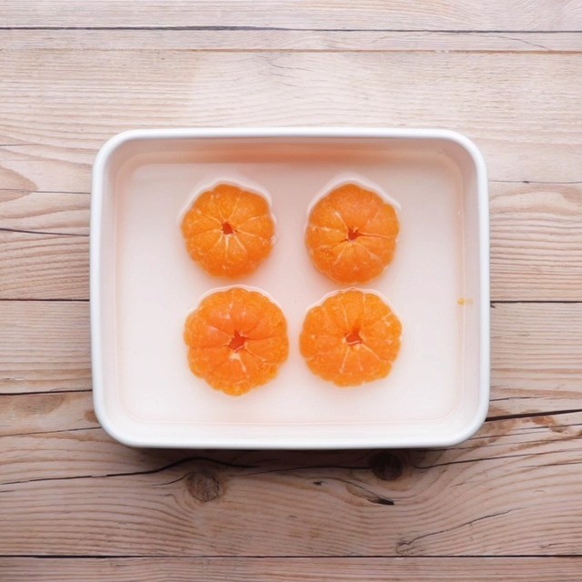 8.丸製氷皿にみかんを入れ、ゼリー液を注ぐ。冷蔵庫で3-4時間冷やし固める。