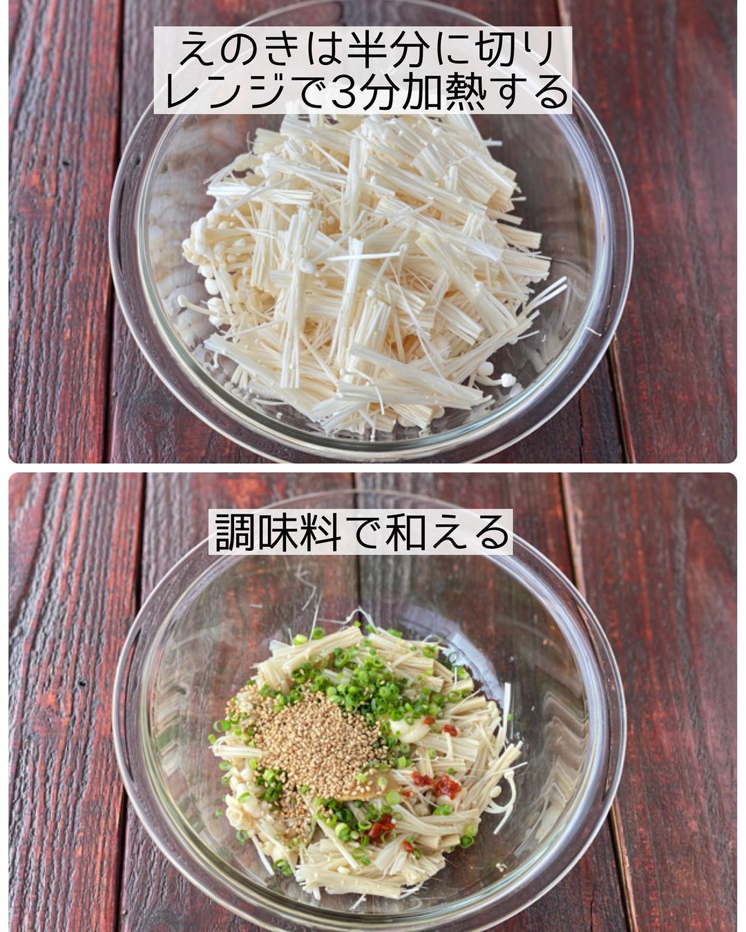 ➊えのきだけは石突きを落として長さを半分に切り、耐熱容器に入れる。ふんわりラップをし、電子レンジ𝟼𝟶𝟶𝚠で𝟹分ほど加熱する。
