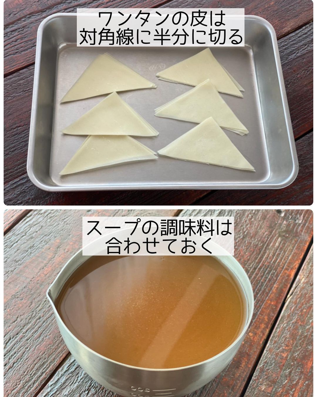 ➊ワンタンの皮は対角線で半分に切る。〔𝙰〕は合わせておく。