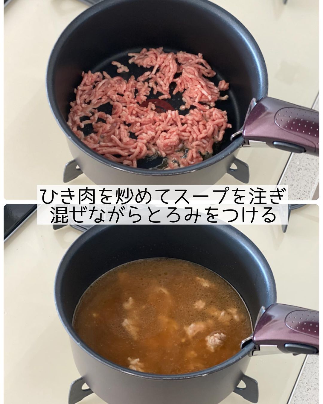 ➋鍋にごま油を中火で熱し、ひき肉を炒める。肉の色が変わったら〔𝙰〕を加え、混ぜながらとろみをつける。