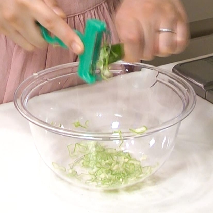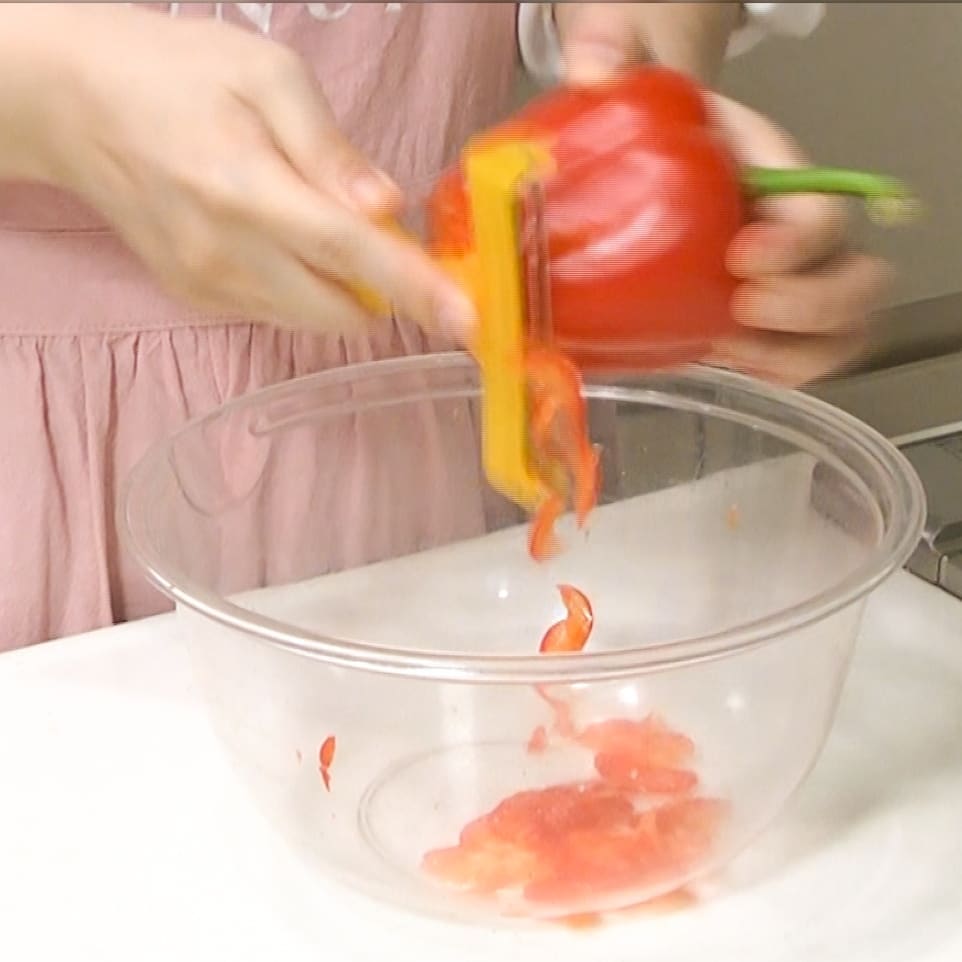 ①パプリカ1/4個、オクラ1/3本をスライス、長芋100gを千切りする