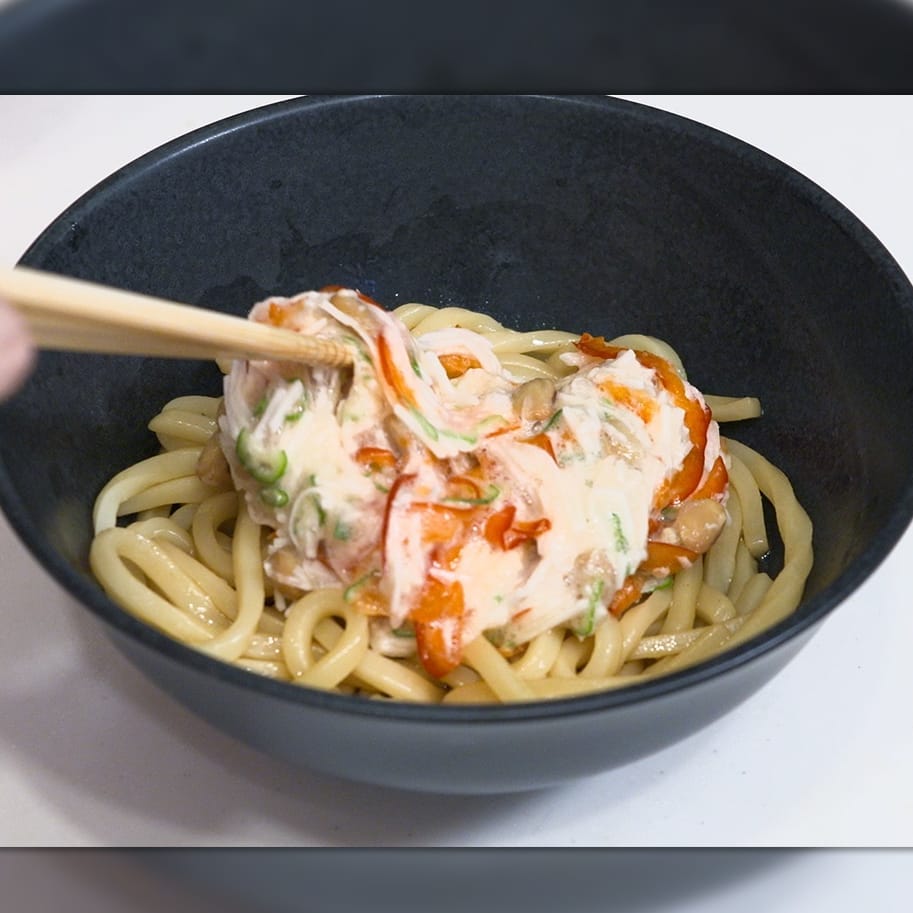 ⑤うどんにだし醤油大さじ2を混ぜ、ごま油とレモン汁を各大さじ1/2〜1を加えさらに混ぜる