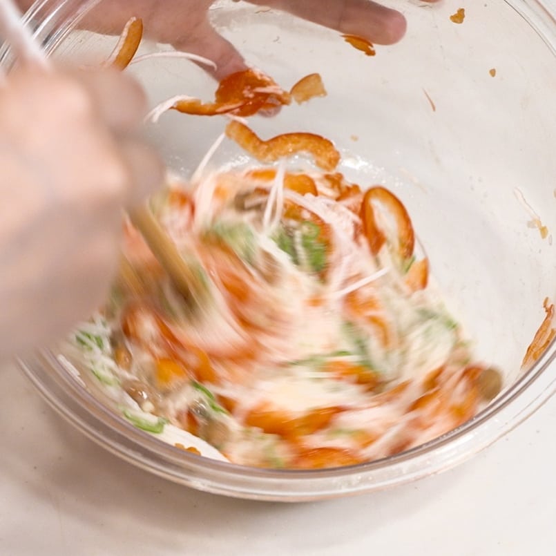 ④切った野菜に納豆 1パックを混ぜ合わせる