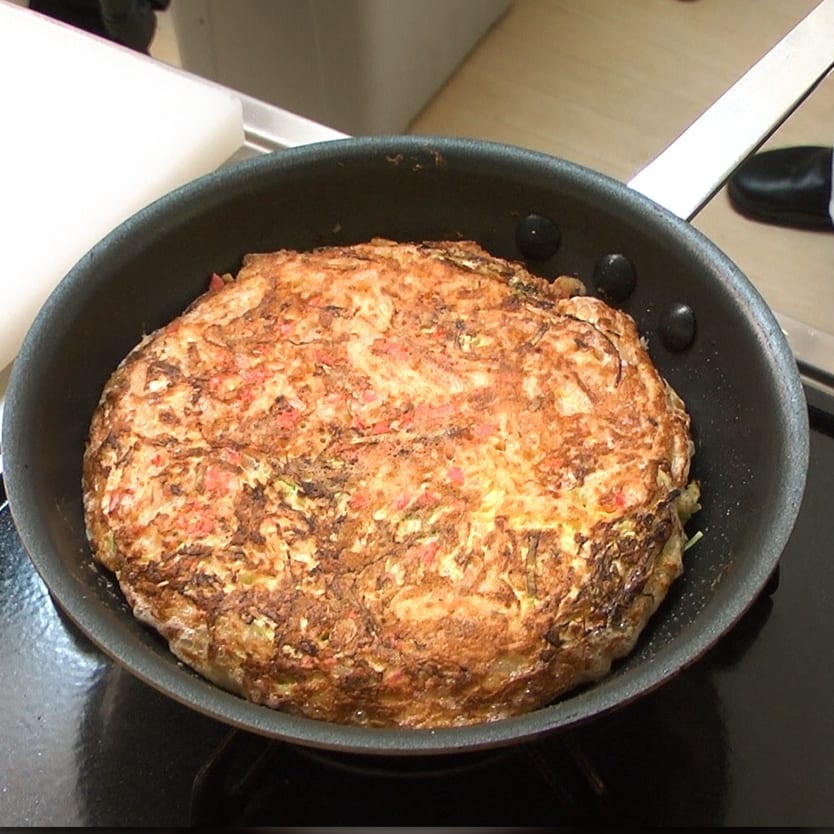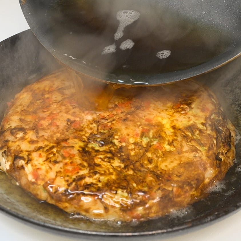 ⑤油をひきフライパンに生地を流し入れ、中火で3~5分焼いたらひっくり返しもう片面も3~5分焼く