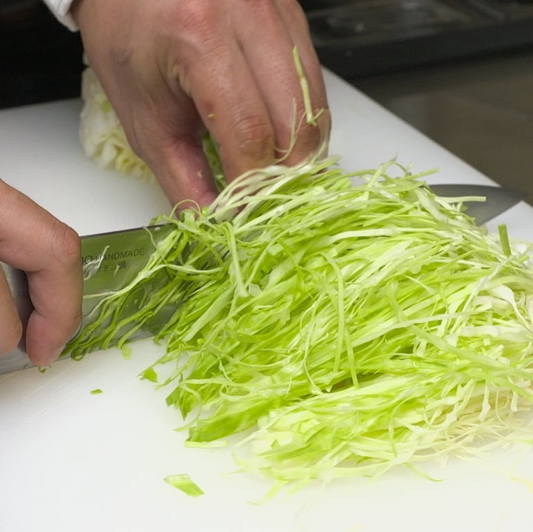 ①キャベツ1/8玉を千切りする