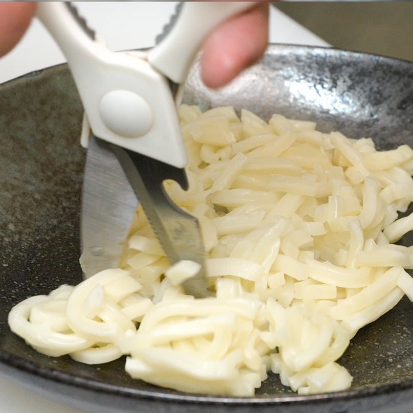 ③ハサミでうどんをカットする