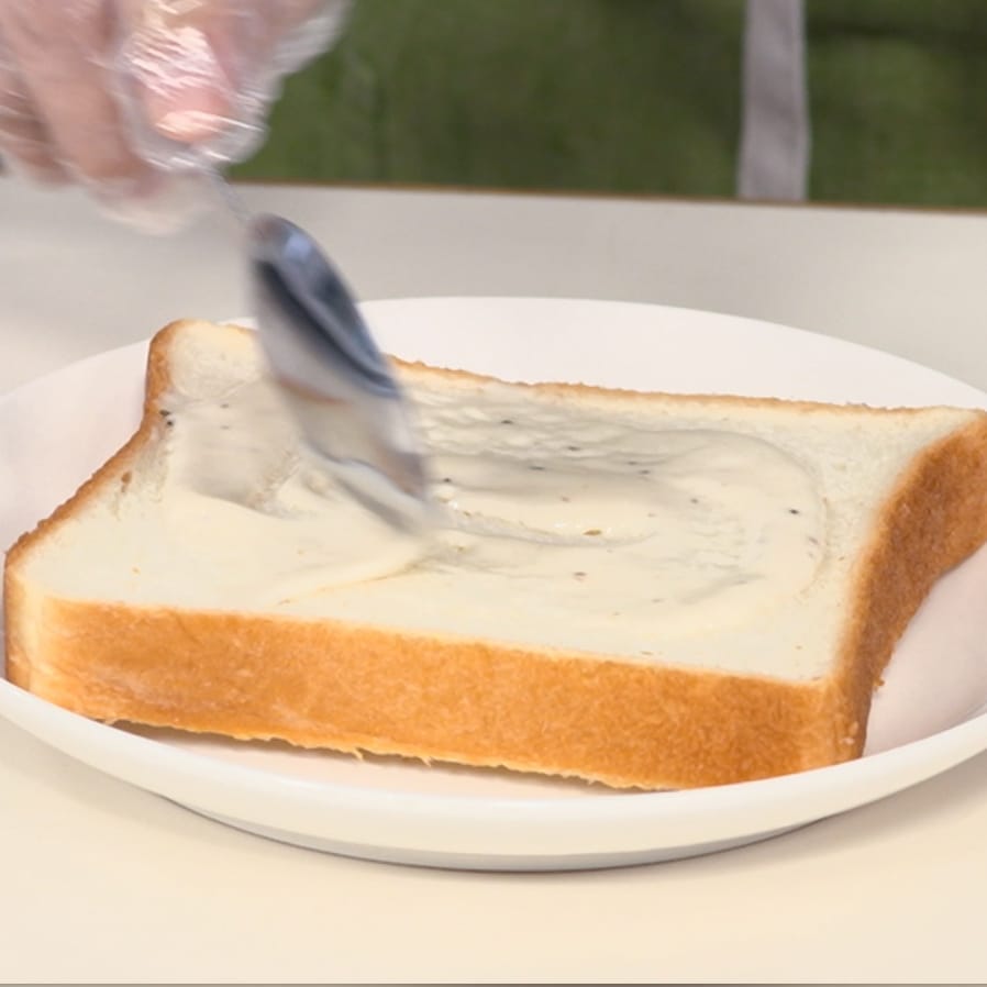①食パン(6枚切り)にシーザードレッシング大さじ1を塗る