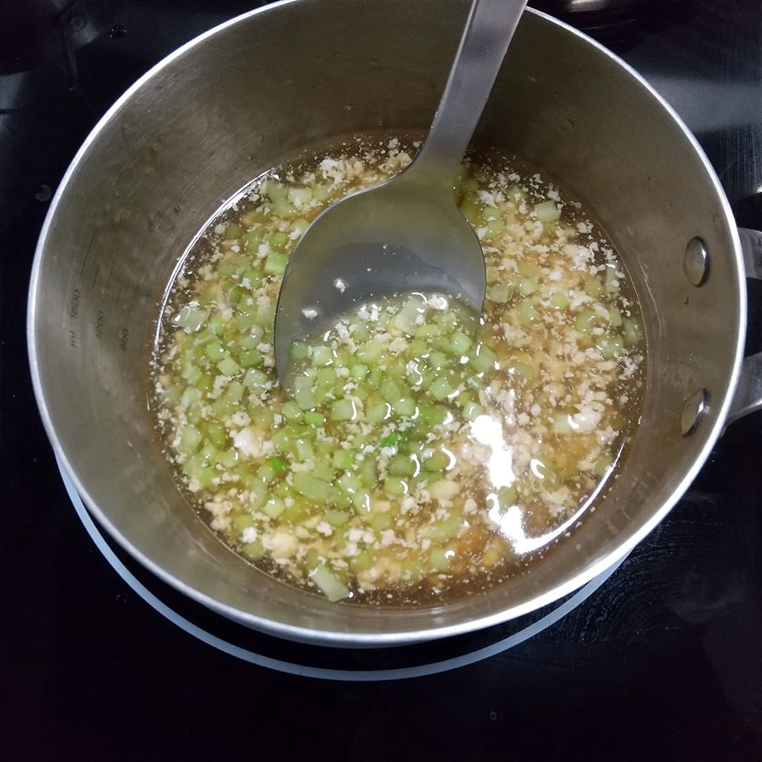 とろみが付いたら火を止め、2.の茎と鶏ひき肉を入れ混ぜる。