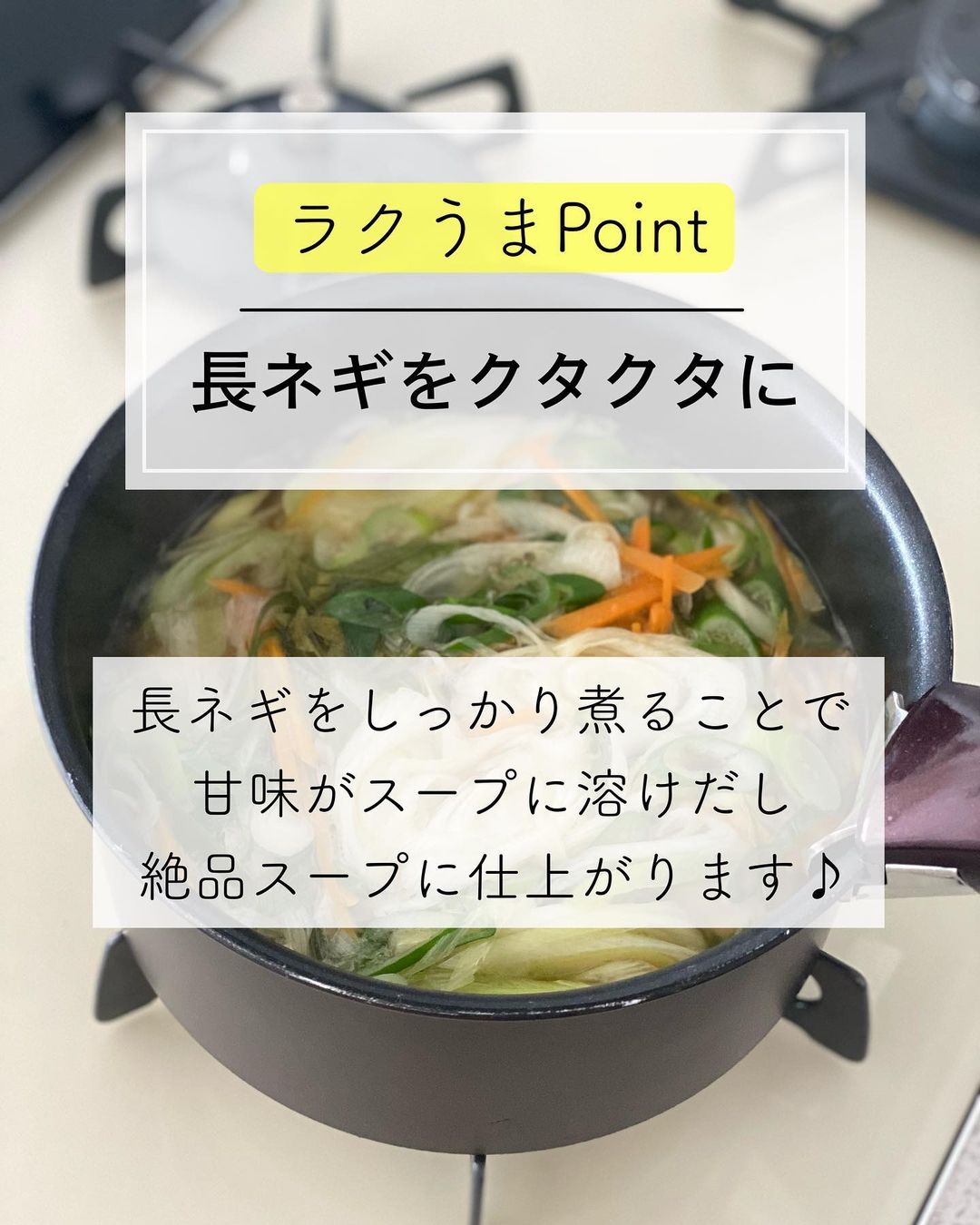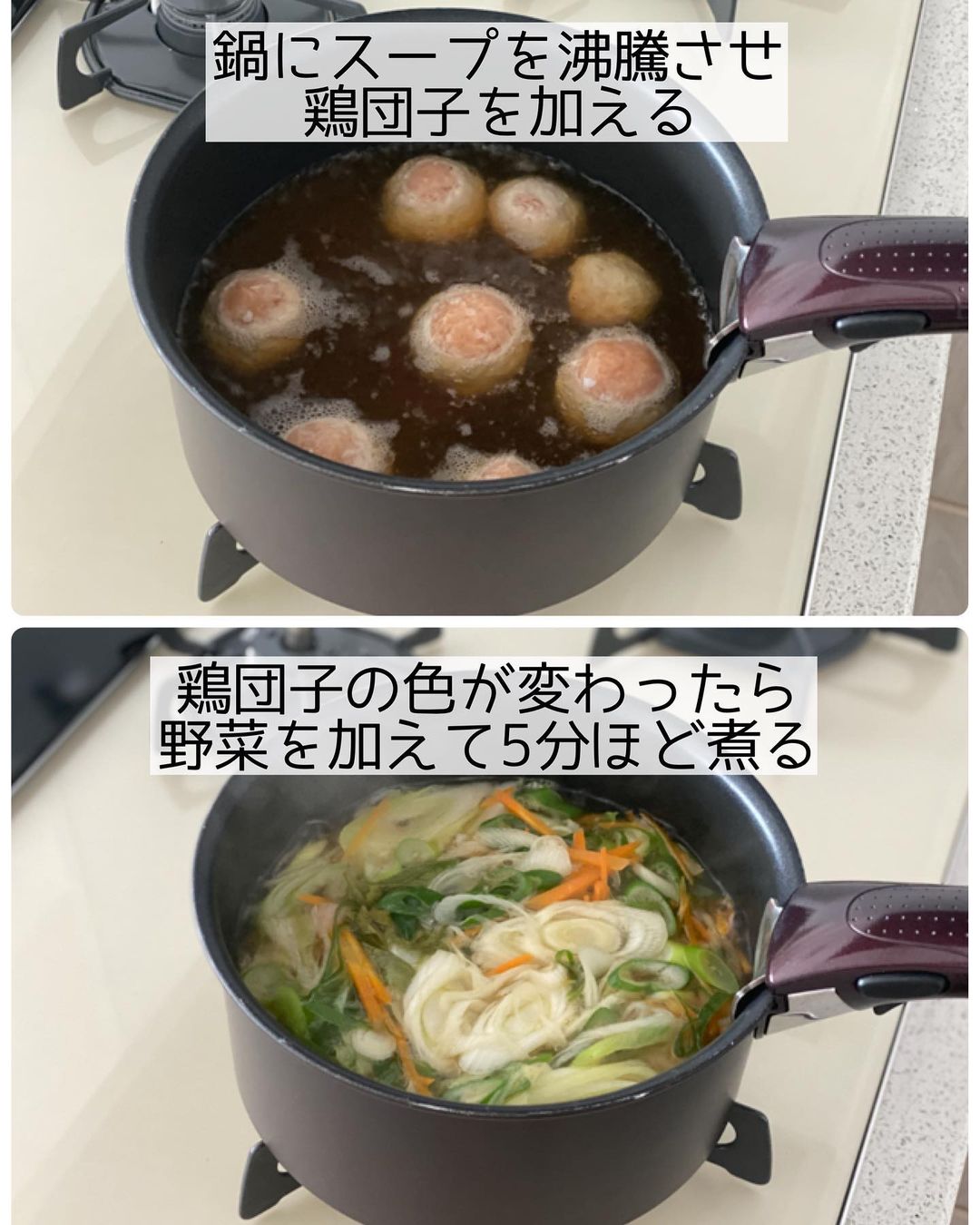 ➋鍋に〔𝙱〕を入れて中火にかけ、沸騰したらひき肉ダネをひと口サイズに丸めて入れる。肉ダネの色が変わったら(完全に火が通っていなくて𝙾𝙺)、長ネギ・にんじんを加えて𝟻分ほど煮る。お好みで白いりごまを散らす。