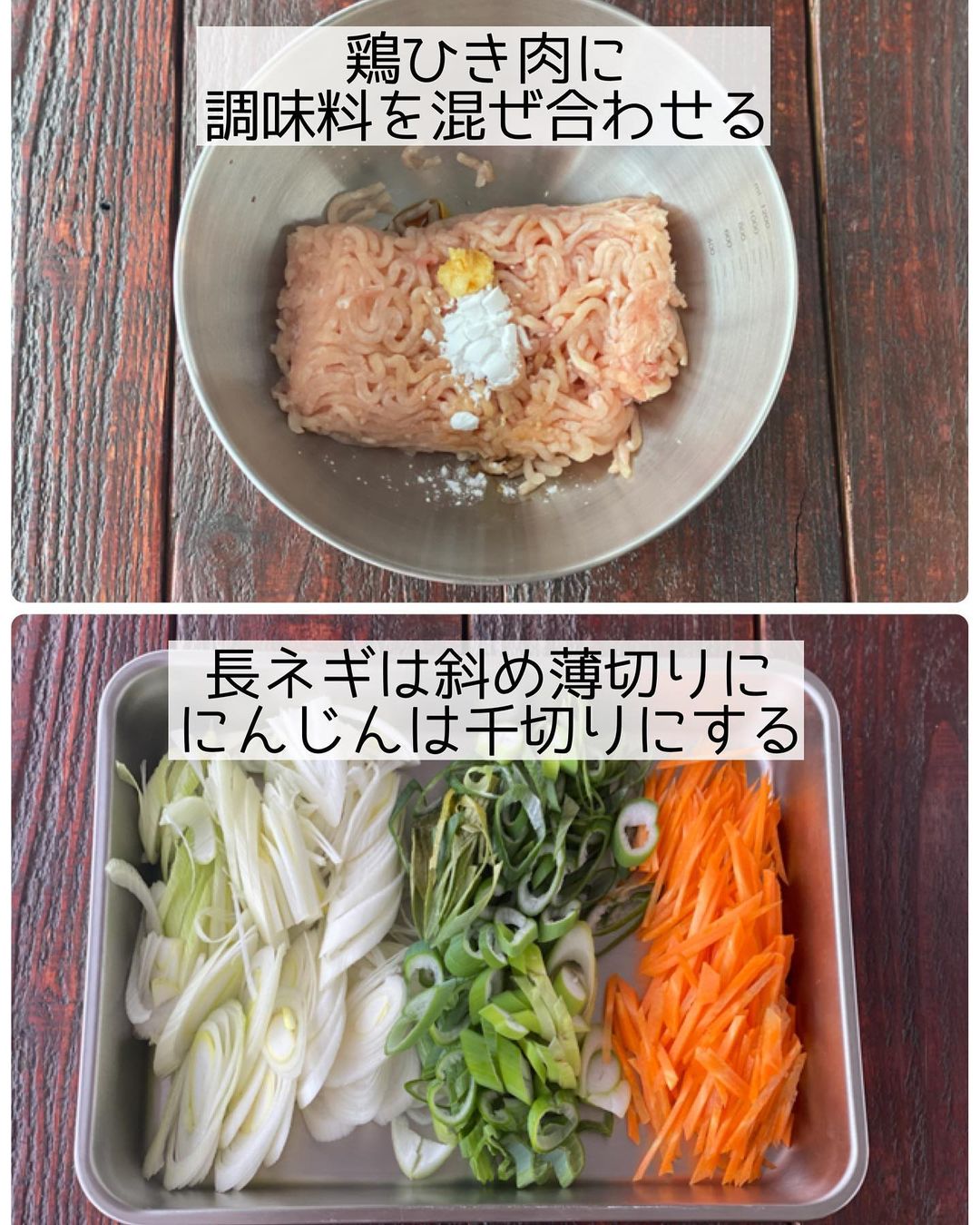 ➊鶏ひき肉・〔𝙰〕をよく混ぜ合わせる。長ネギは斜め薄切りにする(私は青い部分も使いますが、苦手な方は省いても!)。にんじんは千切りにする。