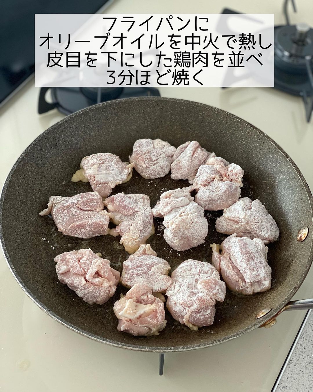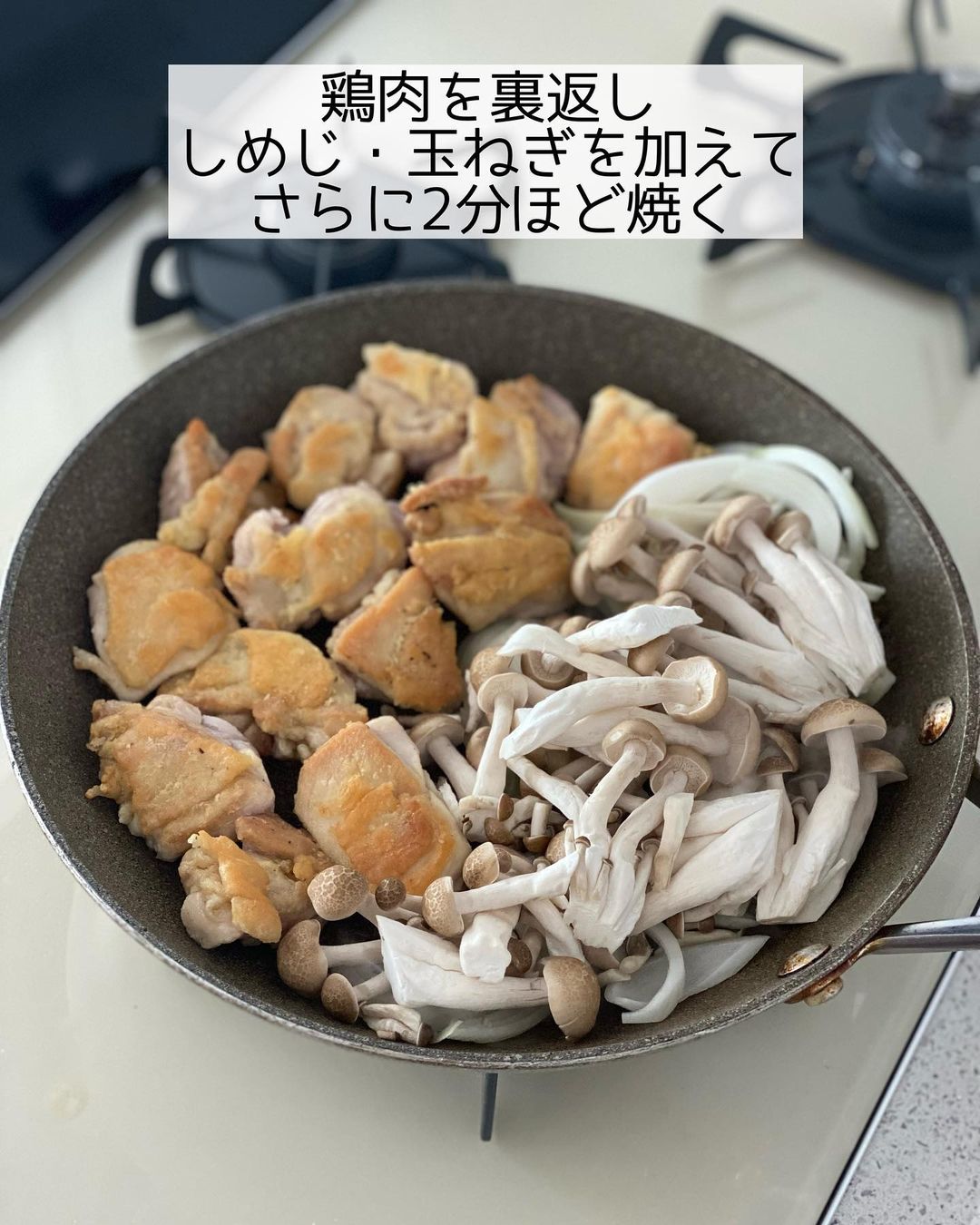➋フライパンにオリーブオイルを中火で熱し、鶏肉の皮目を下にして並べる。𝟹分ほど焼いたら裏返して端に寄せ、空いた部分にしめじと玉ねぎを入れて𝟸分ほど焼く。(しめじと玉ねぎは、時々混ぜ合わせる)