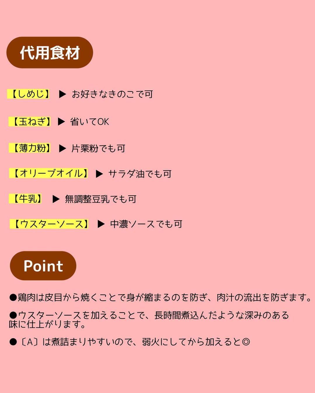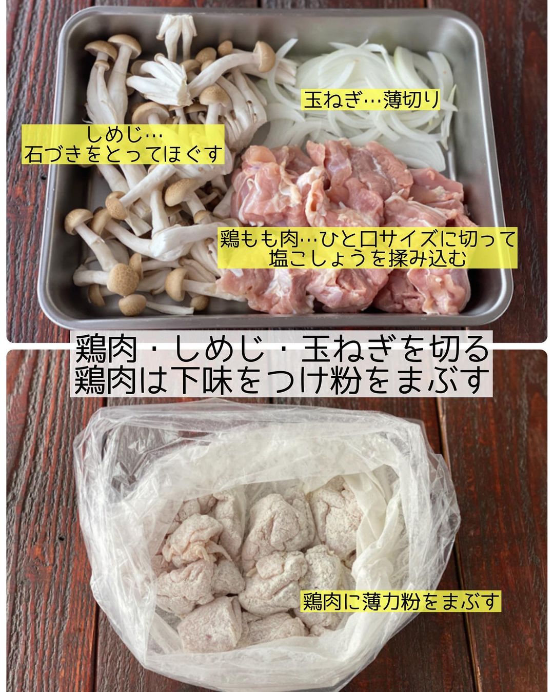 ➊鶏肉はひと口サイズに切って塩・こしょうを揉み込み、薄力粉をまぶす。しめじは石づきをとってほぐし、玉ねぎは薄切りにする。