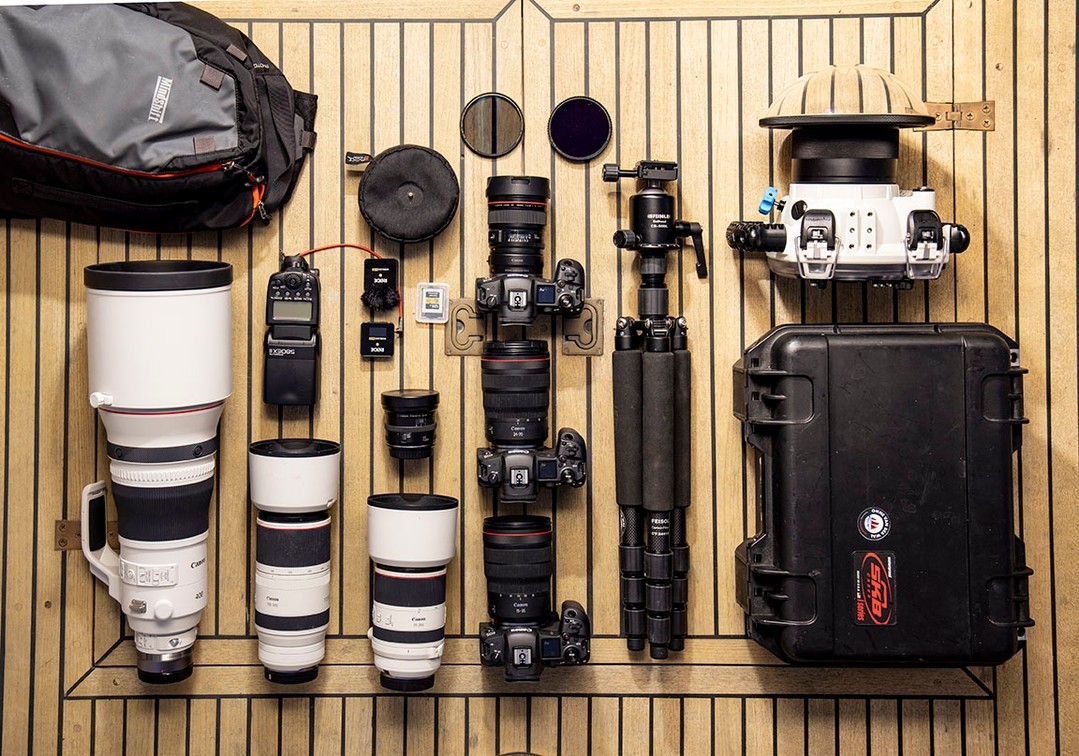I have completely switched over to the Canon mirrorless EOS R system with three EOS R5 cameras and RF lenses. I love the shape and size of these smaller bodies yet the quality is outstanding. The compact size and light weight of these cameras are important for me especially on assignments that require air travel and longer exploratory walks and hikes. On these hiking assignments, I carry a single EOS R5 body, three lenses (with a range of 15-500mm) from the RF15-35mm F2.8L IS USM, RF24-70mm F2.8L IS USM and the RF100-500mm F4.5-7.1 L IS USM in the compact Mindshift Photocross 13 shoulder sling bag. For the exploratory/travel assignments that take me on a boat or kayak where it can get wet and bumpy, I use the SKB #31-1510-6DL waterproof camera box with padded interior dividers.”