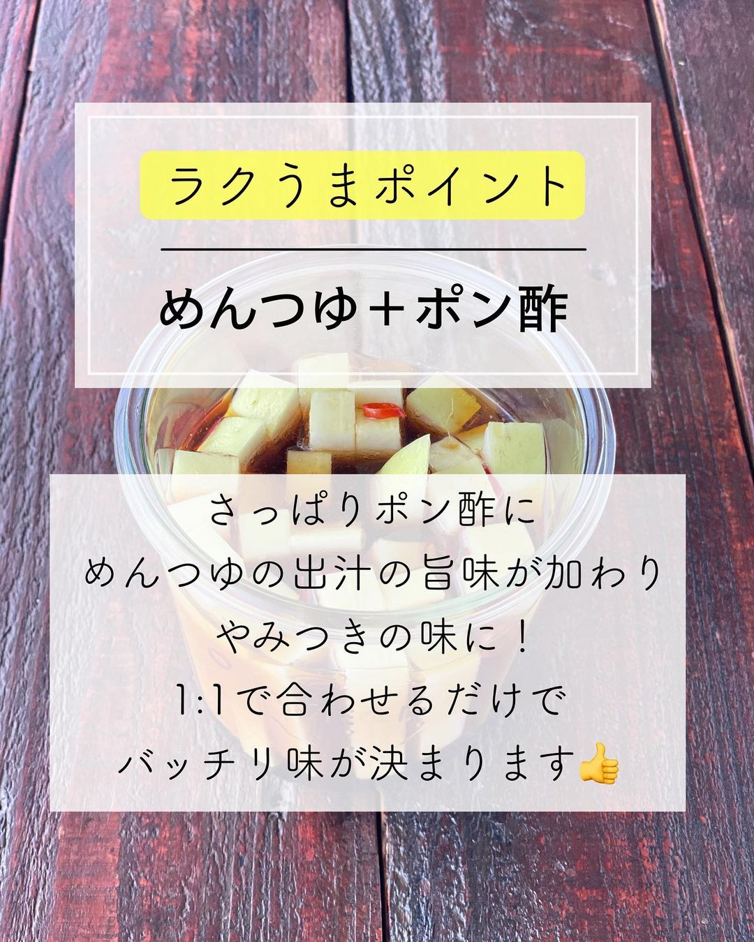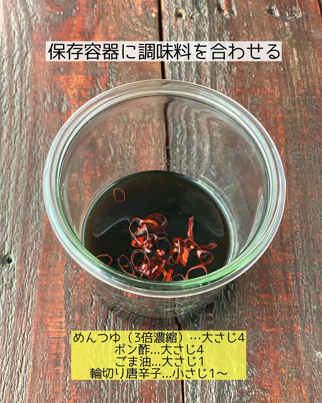 めんつゆ(𝟹倍濃縮)、ポン酢…各大さじ𝟺